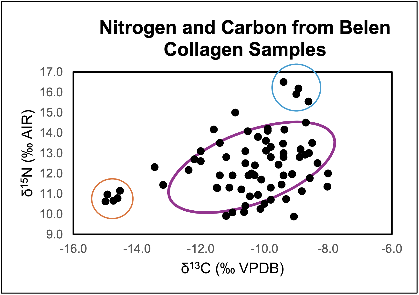 This figure plots carbon isotope values on the horizontal axis against nitrogen isotopic values on the vertical axis. Each dot represents one person from the burial population. Their positions on the plot correspond to differences in the kinds of carbon and nitrogen present in their teeth and skeletons, which helps us reconstruct dietary differences.
