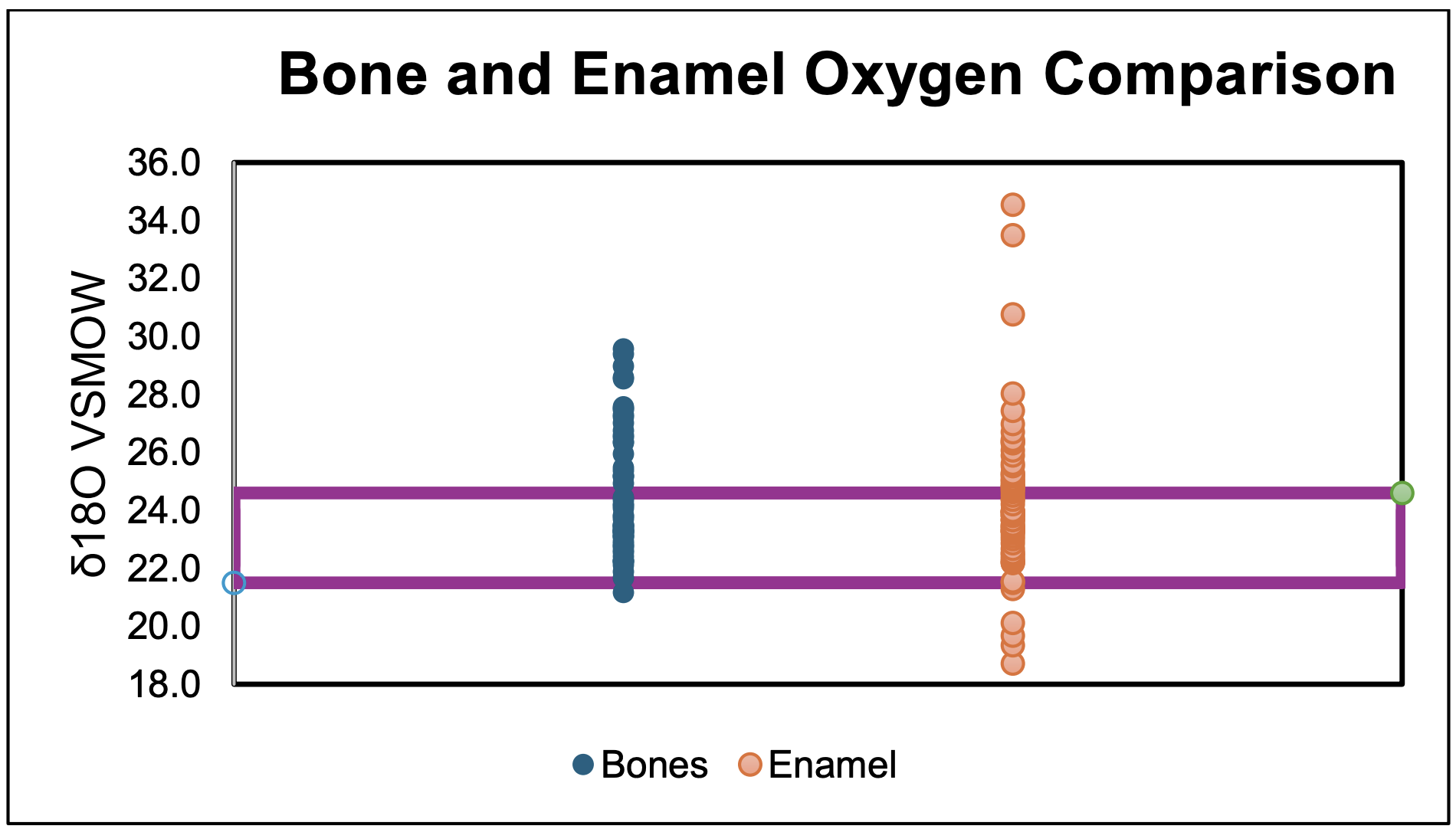 This figure plots the oxygen isotope values of the bone and tooth enamel samples. The purple rectangle refers to the “local" range of oxygen values determined from water samples.